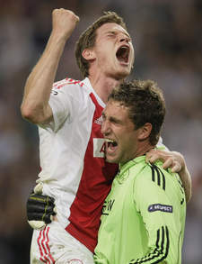 De emoties van Jan Vertonghen en Maarten Stekelenburg na het laatste fluitsignaal, Ajax - Dynamo Kiev, 25 augustus 2010